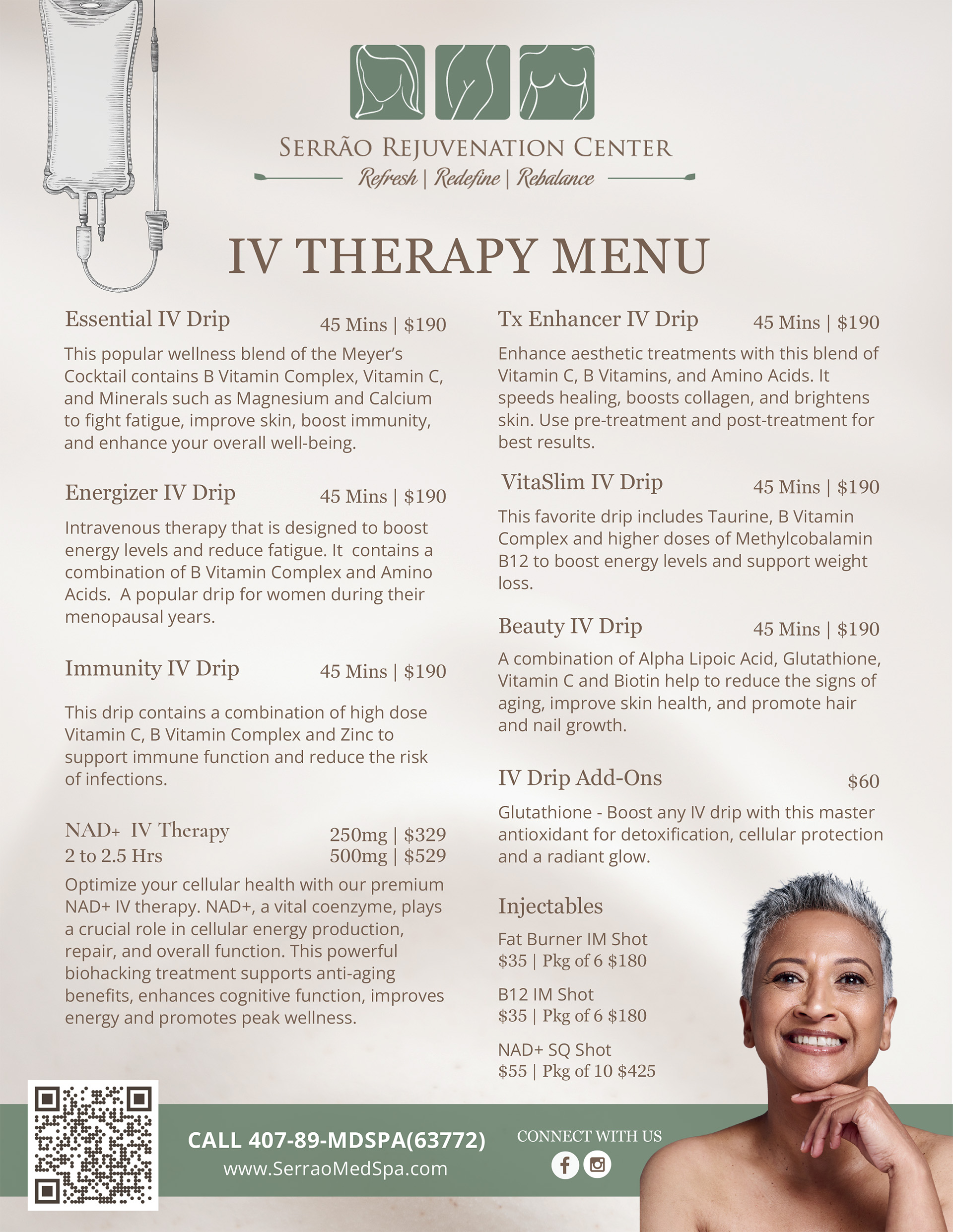 No two people are alike, and while everyone benefits from optimal hydration there is not a one-size-fits-all wellness treatment. Dr. Serrão will be happy to discuss your concerns with you during your consultation, order some specialized bloodwork, and create a customized IV treatment plan that is unique to your needs!